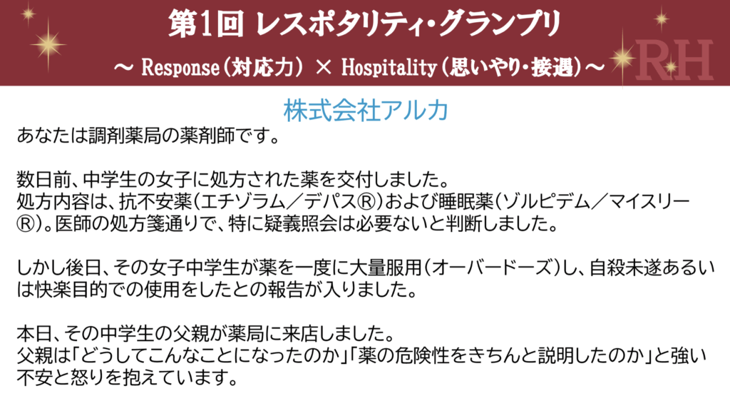 アルカ薬局に出されたのは中学生の女子のオーバードーズの事例で、難易度が高すぎないかと審査員一同、心配していたものだった。
