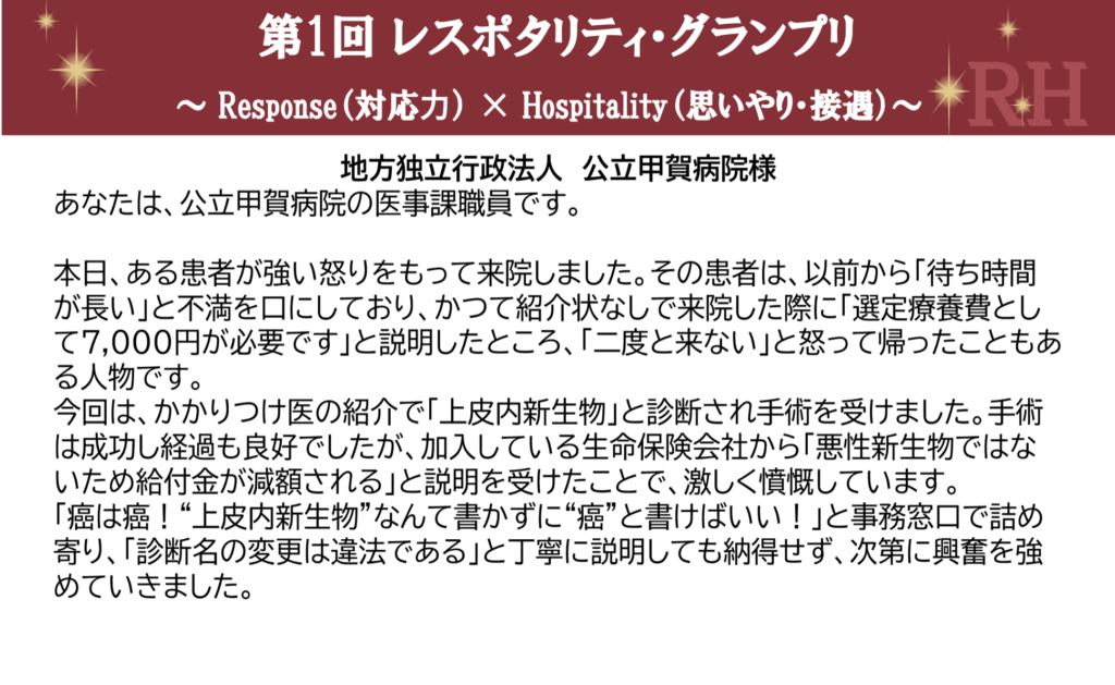 早速、3つの事例をご紹介したい。公立甲賀病院の医事課職員への事例は「生命保険の給付金が低くなるため、一度作成した診断書の診断名を書き換えろ」という激しいクレームであった。