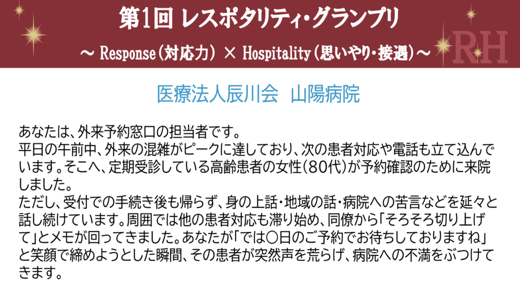 山陽病院の受付スタッフの事例は「何度も同じ話をくり返し、会話をおわそうとすると怒り出し、特別扱いを要求してくる認知症患者への対応」であった。